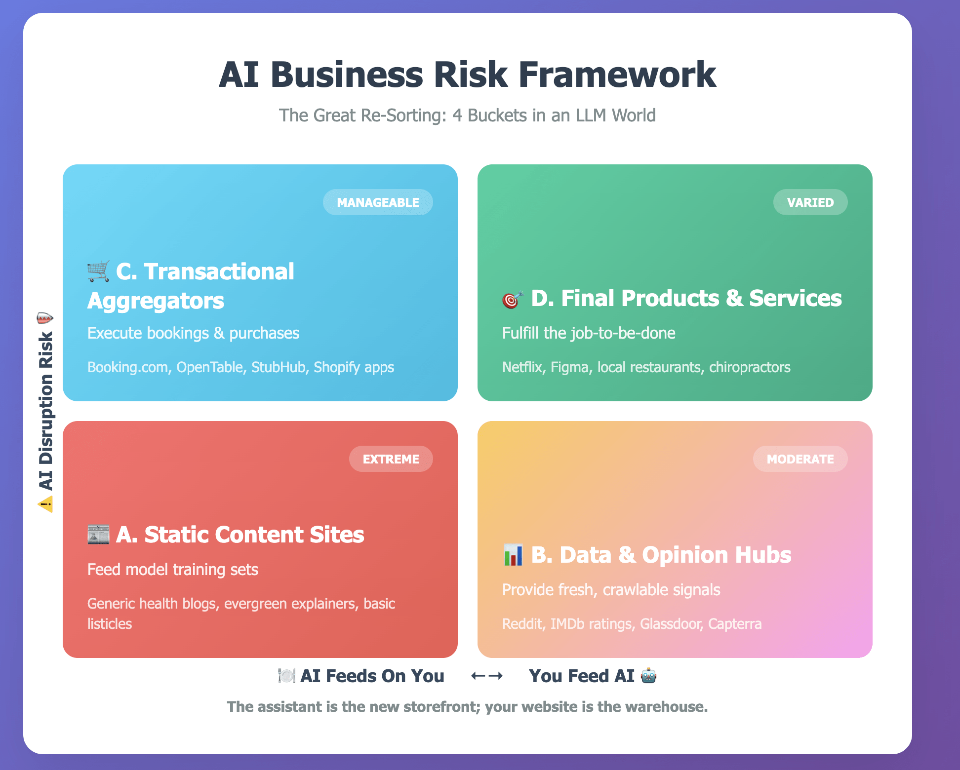 Bucket D is not a permanent safe harbour. Stack Overflow is the product — yet Claude Code or Copilot-style code completion chips away at its reason to exist. By contrast, a neighbourhood restaurant faces a different pressure: AI may redistribute demand (“Book me the highest-rated tapas bar within two kilometres”), but a language model will not be frying calamari any time soon.
