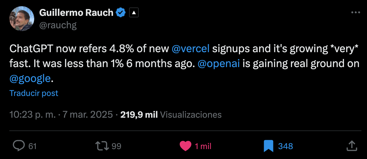 - Els llocs web B2B estan rebent nivells més alts de trànsit d’IA, representant fins al 5-6% del seu trànsit SEO total. Empreses com Vercel informen que reben fins al 5% dels seus nous registres a través de ChatGPT.