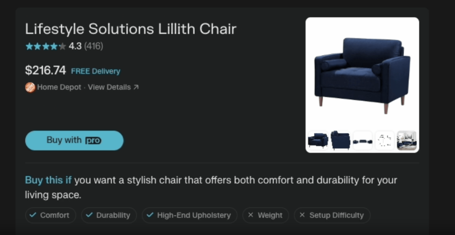 - Això també podria ser rellevant no tant en el concepte de resultats d’IA o entrenament de models d’IA, sinó en accessoris. Considera resultats com Perplexity Shop, que podrien nodrir-se d’un Schema de Producte. Mira la imatge a sota. Preu, lliurament, etc. Podria nodrir-se d’un markup Schema amb molta probabilitat.